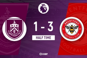 伤停补时3分钟。上半场比赛结束,伯恩利1-3布伦特福德。