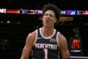 GIF-杰伦·约翰逊强突顶着两人双手滑翔暴扣
